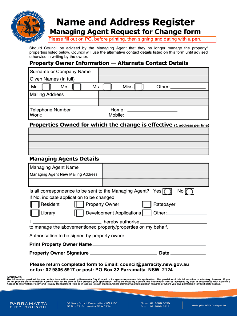 Get the free Name and Address Register Managing Agent Request for Change form - parracity nsw gov