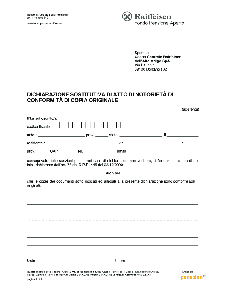 Script Allan die Fond Pension econ IL number 149 www.fondopensioneraiffeisen.it Spent. Le Cassia Central Ruffian dealt Adage Spa Via Lauren 1 39100 Bolzano (BY) DICHIARAZIONE CONSTITUTIVE DI AUTO