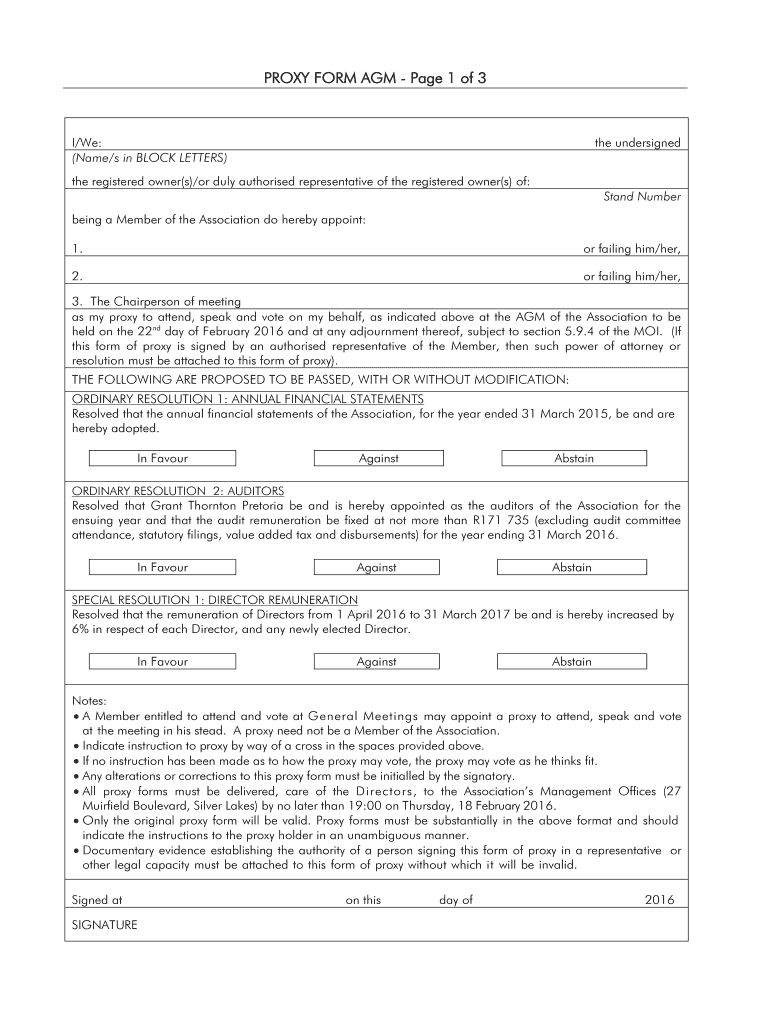 PROXY FORM AGM Page 1 of 3 I/We: (Name/s in BLOCK LETTERS) the undersigned the registered owner(s)/or duly authorized representative of the registered owner(s) of: Stand Number being a Member of the
