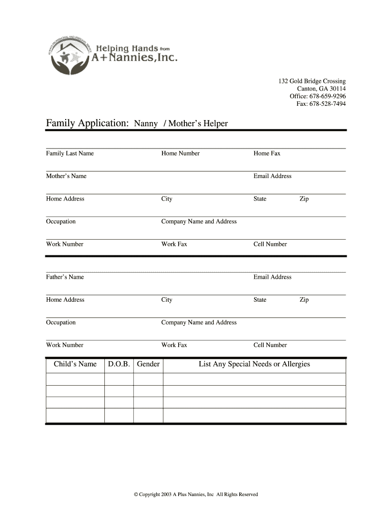 132 Gold Bridge Crossing Canton, GA 30114 Office: 6786599296 Fax: 6785287494 Family Application: Nanny / Mothers Helper Family Last Name Home Number Mothers Name Home Fax Email Address Home Address