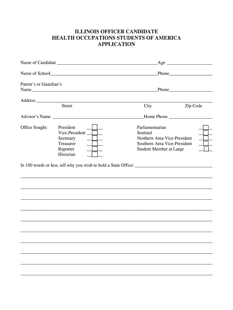 ILLINOIS OFFICER CANDIDATE HEALTH OCCUPATIONS STUDENTS OF AMERICA APPLICATION Name of Candidate Age Name of School Phone Parents or Guardians Name Phone Address Street City Zip Code Advisors Name