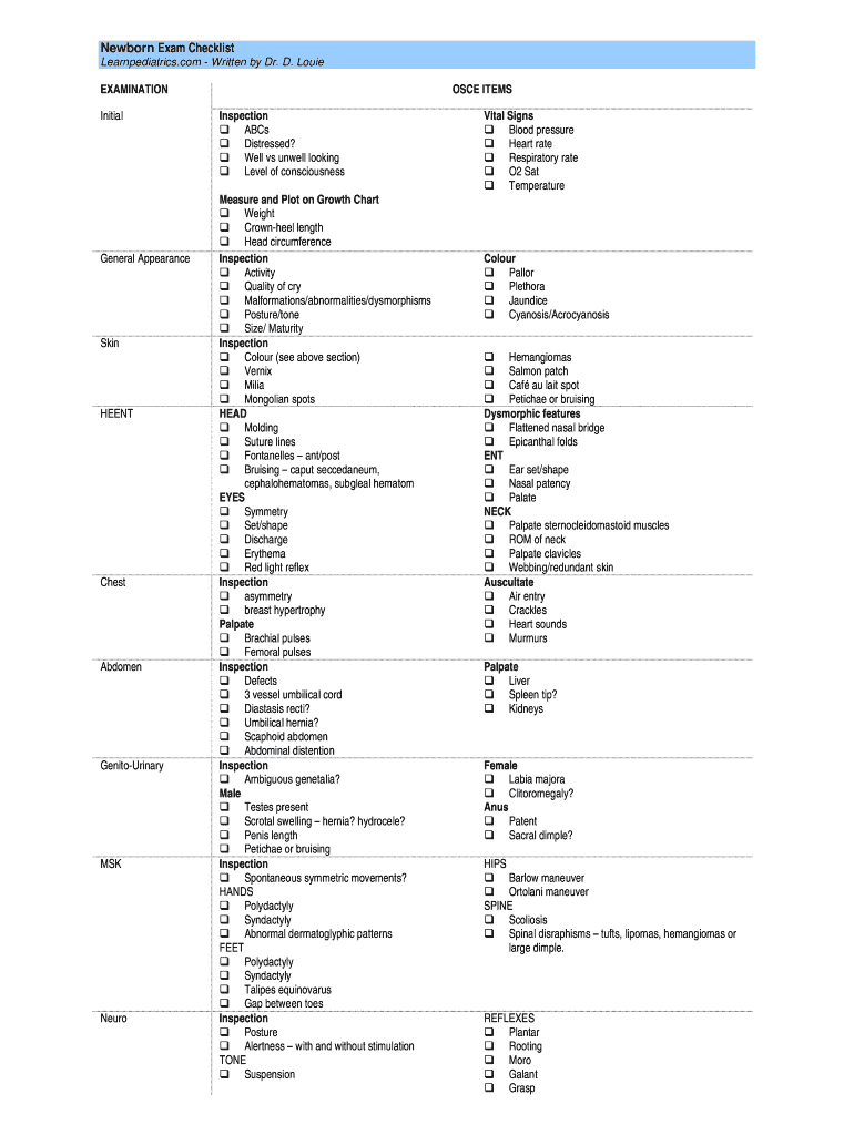 Newborn Exam Checklist Learnpediatrics.com Written by Dr. D. LouieEXAMINATION InitialGeneral AppearanceSkinHEENTChestAbdomenGenitoUrinaryMSKNeuroOSCE ITEMS Inspection ABCs Distressed? Well vs unwell