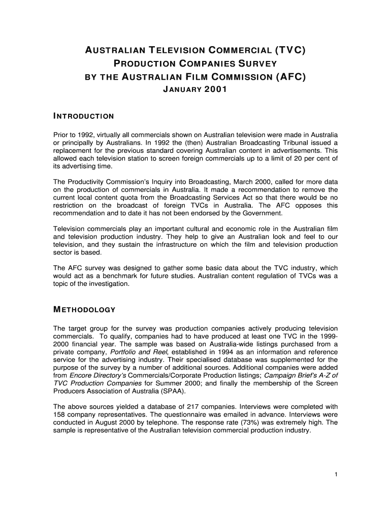 Get the free AUSTRALIAN TELEVISION COMMERCIAL (TVC) PRODUCTION COMPANIES SURVEY