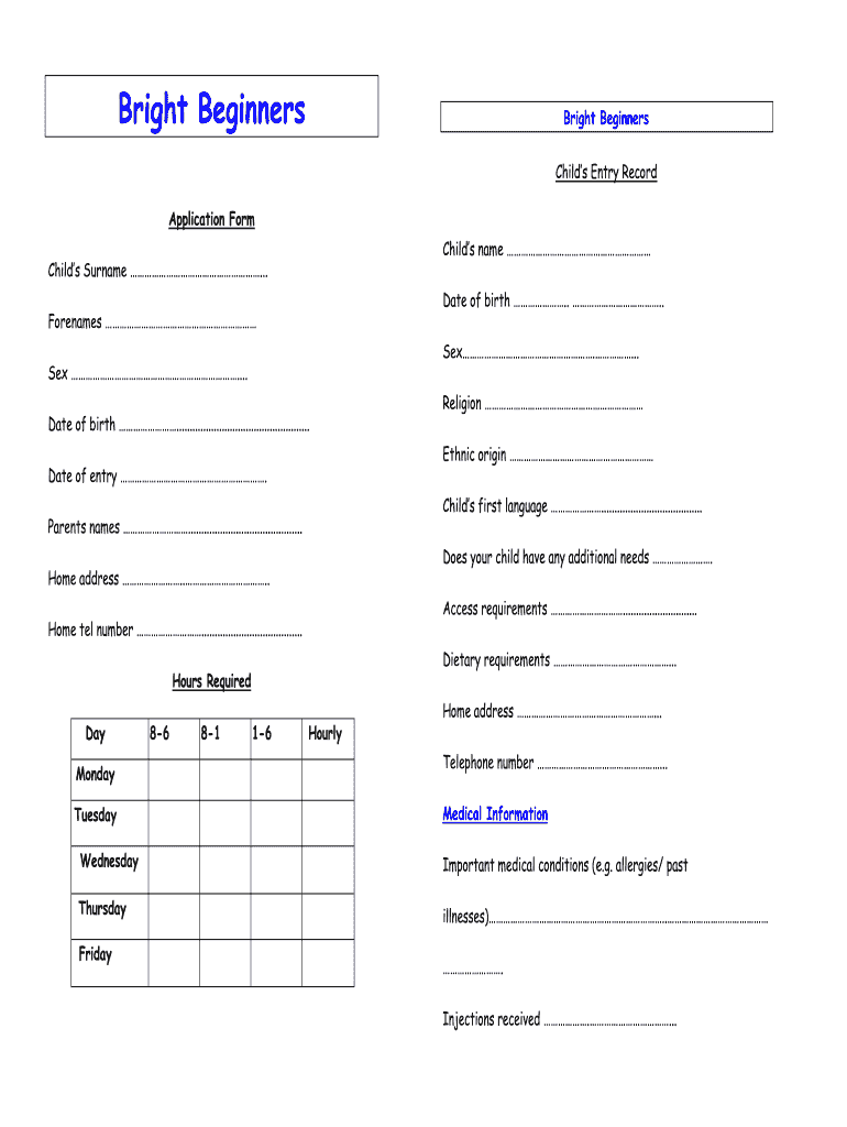 Bright Beginners Child's Entry Record Application Form Child's name Child's Surname ... Date of birth. . Forenames Sex.... Sex