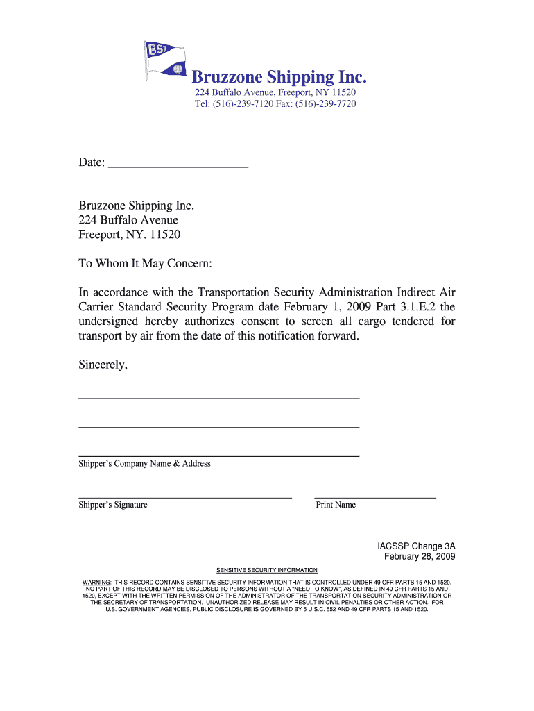 Buzzing Shipping Inc. 224 Buffalo Avenue, Freeport, NY 11520 Tel: (516)2397120 Fax: (516)2397720 Date: Buzzing Shipping Inc. 224 Buffalo Avenue Freeport, NY. 11520 To Whom It May Concern: In accordance