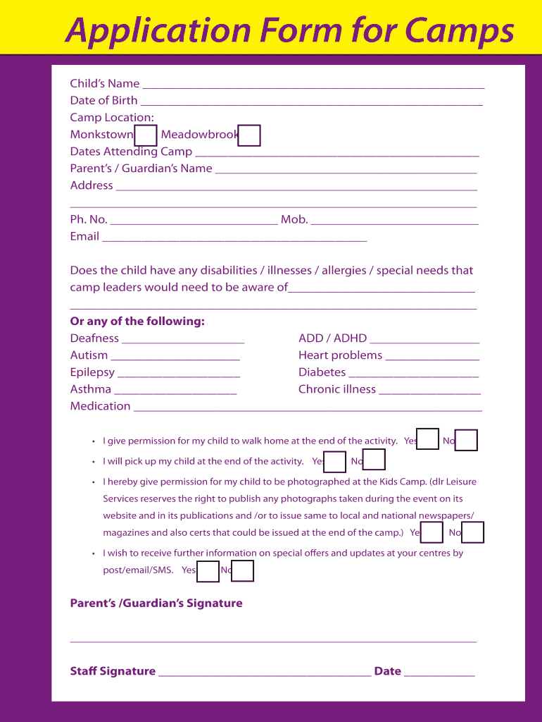 Application Form for Camps Child's Name Date of Birth Camp Location: Monks town q Meadow brook q Dates Attending Camp Parents / Guardians Name Address pH. No. Mob. Email Does the child have any disabilities
