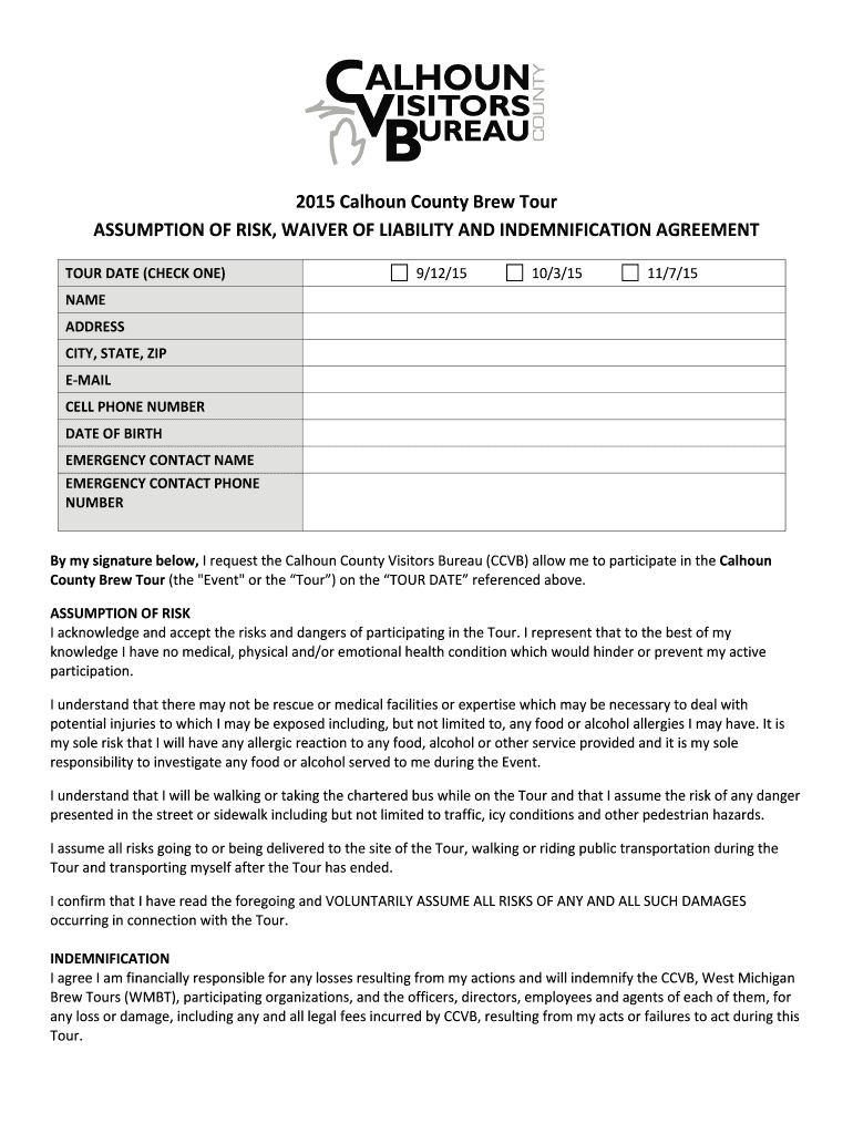 2015CalhounCountyBrewTour ASSUMPTIONOFRISK, WAIVEROFLIABILITYANDINDEMNIFICATIONAGREEMENT TOURETTE(CHECK ONE) 9/12/15 NAME CITY, STATE, ZIP EMAIL CELLPHONENUMBER DATEOFBIRTH EMERGENCYCONTACTNAME EMERGENCYCONTACTPHONE