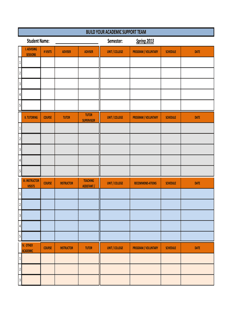 StudentName: BUILDYOURACADEMICSUPPORTTEAM Semester: Spring2013 I.ADVISING SESSIONS #VISITS ADVISER UNIT/COLLEGE PROGRAM/VOLUNTARY SCHEDULE DATE II.TUTORING COURSE TUTOR SUPERVISOR UNIT/COLLEGE PROGRAM/VOLUNTARY