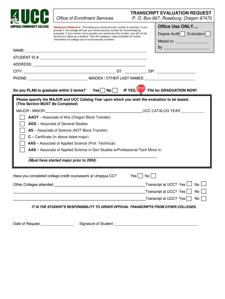 Office of Enrollment Services TRANSCRIPT EVALUATION REQUEST P. O. Box 967, Roseburg, Oregon 97470 Office Use ONLY.... Disclosure Statement: “Providing your social security number is voluntary. If