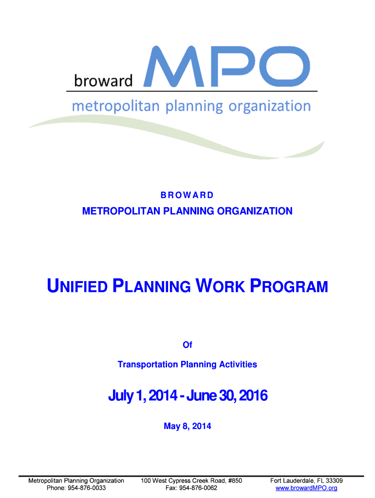 BROWARD METROPOLITAN PLANNING ORGANIZATION UNIFIED PLANNING WORK PROGRAM Of Transportation Planning Activities July 1, 2014 – June 30, 2016, May 8, 2014, Metropolitan Planning Organization Phone: