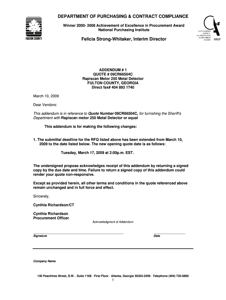 DEPARTMENT OF PURCHASING & CONTRACT COMPLIANCE Winner 2000 2008 Achievement of Excellence in Procurement Award National Purchasing Institute Felicia Strong Whitaker, Interim Director ADDENDUM # 1