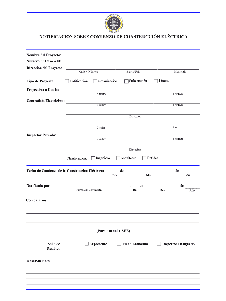 NOTIFICATION SORE COMING DE CONSTRUCTION ELECTRIC Hombre Del Project: Nero de Caso AEE: Direction Del Project: Called y Nero Barrio/URB.