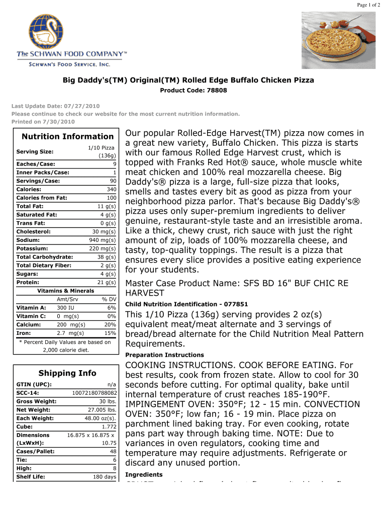 Page 1 of 2 Big Daddies™ Original™ Rolled Edge Buffalo Chicken Pizza Product Code: 78808 Last Update Date: 07/27/2010 Please continue to check our website for the most current nutrition information.