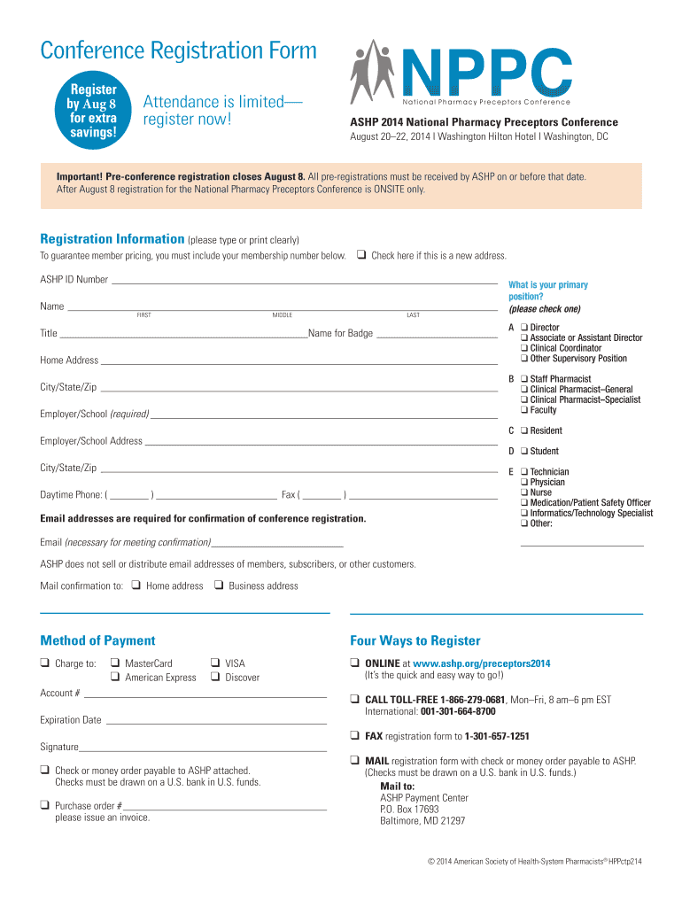 Conference Registration Form Register by Aug 8 for extra savings! Attendance is limited register now! ASH 2014 National Pharmacy Preceptors Conference August 2022, 2014 I Washington Hilton Hotel I