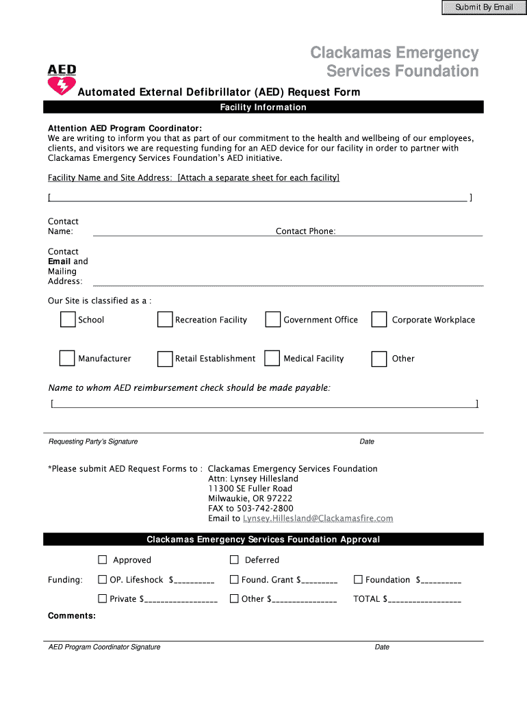 Submit By Email Clacks Emergency Services Foundation Automated External Defibrillator (AED) Request Form Facility Information Attention AED Program Coordinator: We are writing to inform you that as