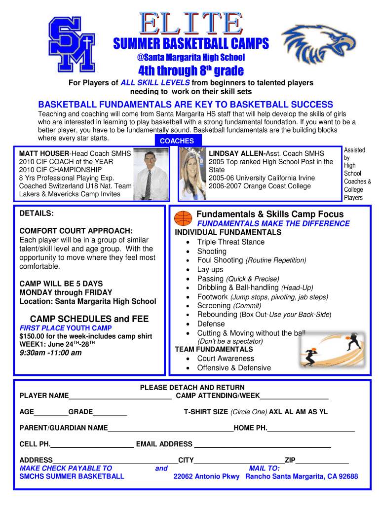 SUMMER BASKETBALL CAMPS Santa Margarita High School 4th through 8th grade For Players of ALL SKILL LEVELS from beginners to talented players needing to work on their skill sets BASKETBALL FUNDAMENTALS