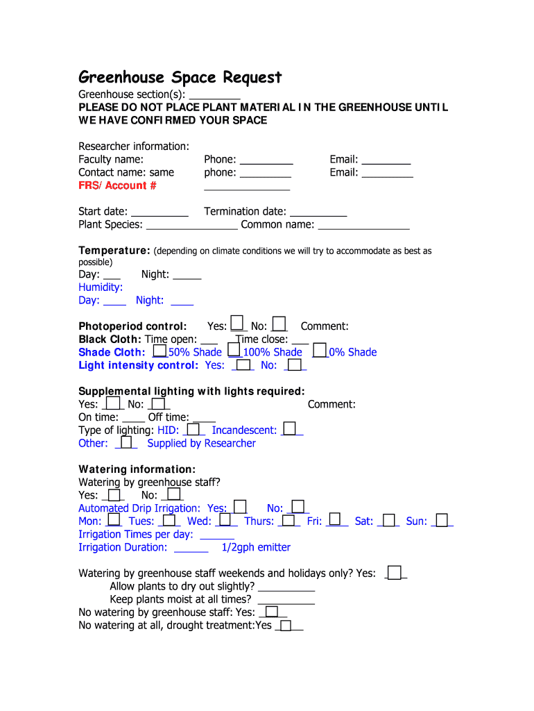 Greenhouse Space Request Greenhouse section(s): PLEASE DO NOT PLACE PLANT MATERIAL IN THE GREENHOUSE UNTIL WE HAVE CONFIRMED YOUR SPACE Researcher information: Faculty name: Contact name: same FRS/Account