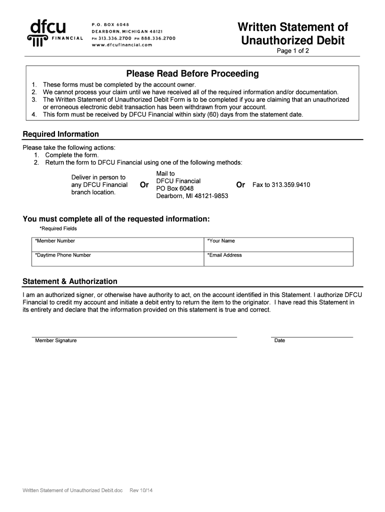 Get the free Written Statement of Unauthorized Debit - dfcufinancialcom