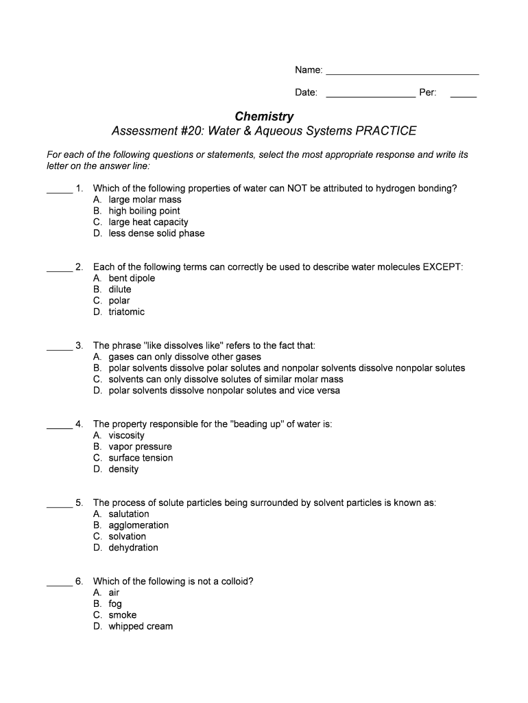 Name: Date: Per: Chemistry Assessment #20: Water & Aqueous Systems PRACTICE For each of the following questions or statements, select the most appropriate response and write its letter on the answer