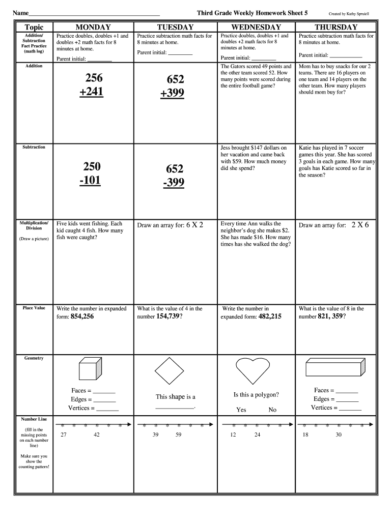 Name Third Grade Weekly Homework Sheet 5 Topic MONDAY TUESDAY Addition/ Subtraction Fact Practice (math log) Practice doubles, doubles +1 and doubles +2 math facts for 8 minutes at home. Practice