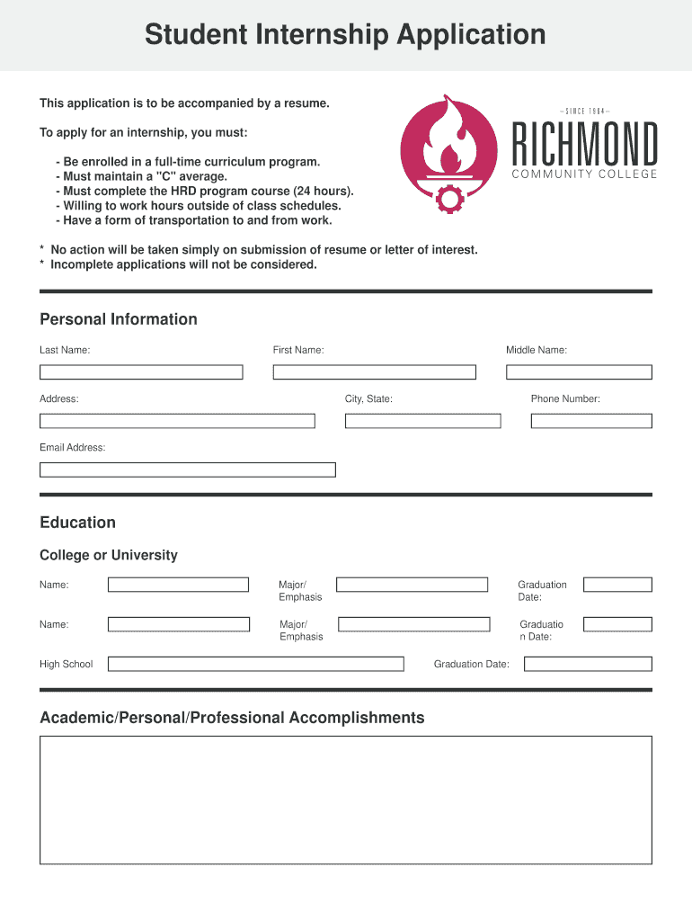 Student Internship Application This application is to be accompanied by a resume. To apply for an internship, you must: Be enrolled in a full time curriculum program. Must maintain a “C average.