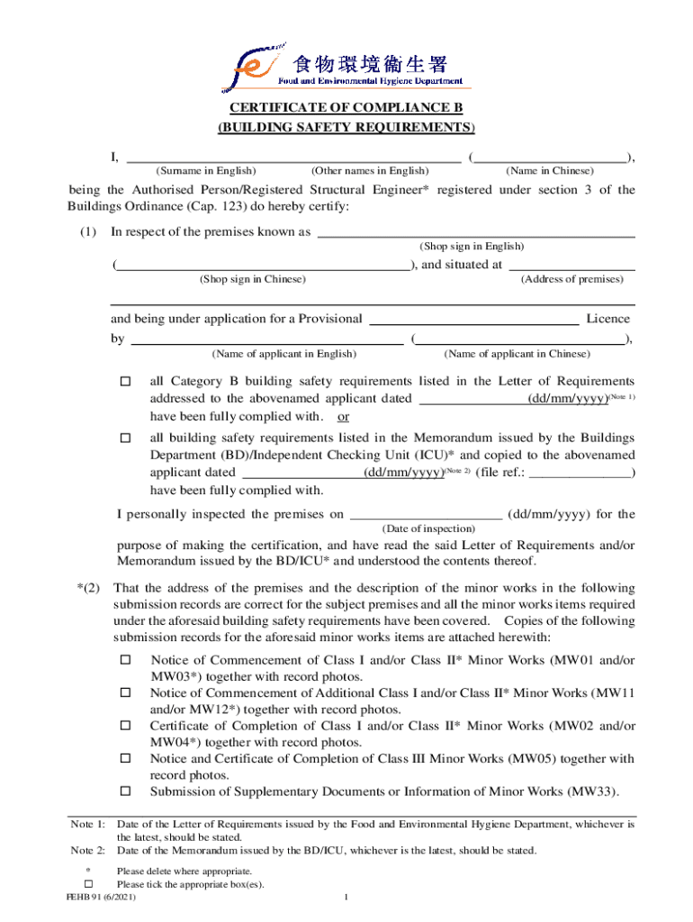 CERTIFICATE OF COMPLIANCE B (BUILDING SAFETY REQUIREMENTS) I, ((Surname in English)(Other names in English)), (Name in Chinese)being the Authorized Person/Registered Structural Engineer* registered