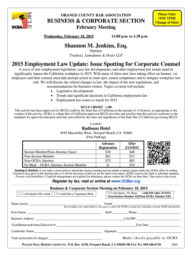 ORANGE COUNTY BAR ASSOCIATION BUSINESS & CORPORATE SECTION Please Note: ONE TIME Change of Date! February Meeting Wednesday, February 18, 2015 12:00 p.m. to 1:30 p.m. Shannon M. Jenkins, Esq. Partner