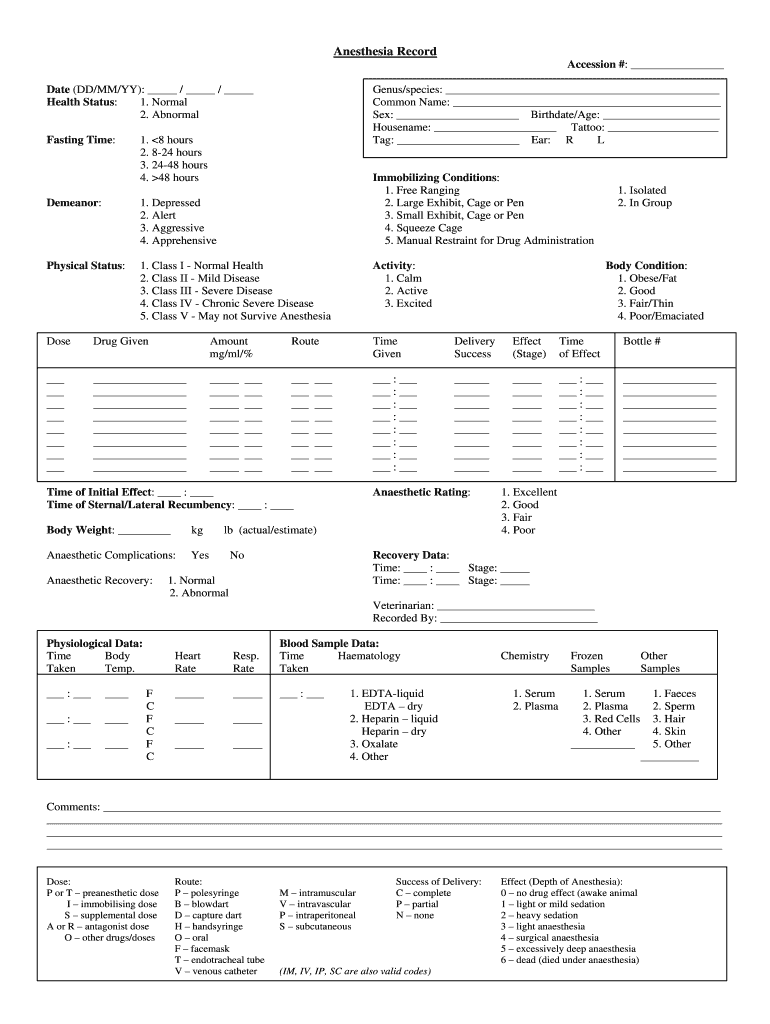 Anesthesia Record Accession #: Date (DD/MM/BY): / / Health Status: 1. Normal 2. Abnormal Fasting Time: Genus/species: Common Name: Sex: Birthdate/Age: House name: Tattoo: Tag: Ear: R L 1. 8 hours