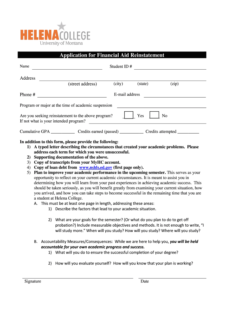 Application for Financial Aid Reinstatement Name Student ID # Address (street address) (city) (state) (zip) Email address Phone # Program or major at the time of academic suspension Are you seeking