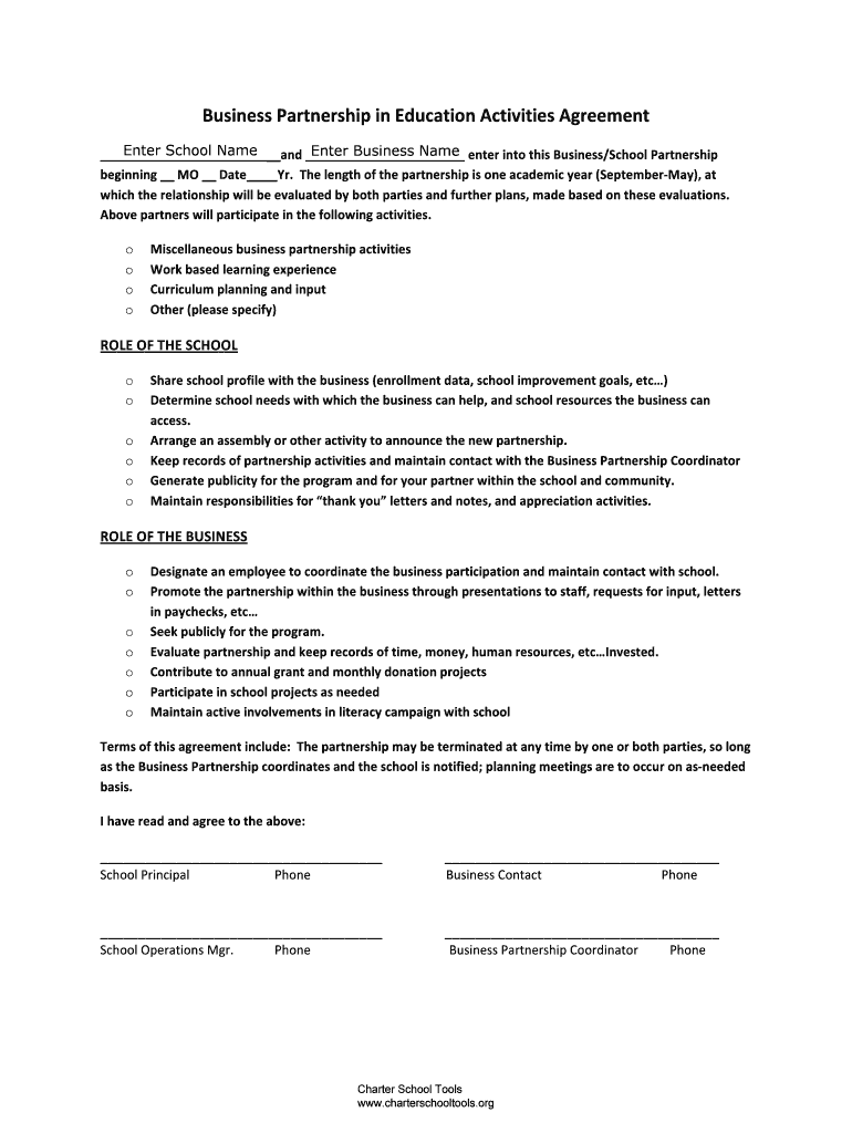 Get the free Business Partnership in Education Activities Agreement - charterschooltools