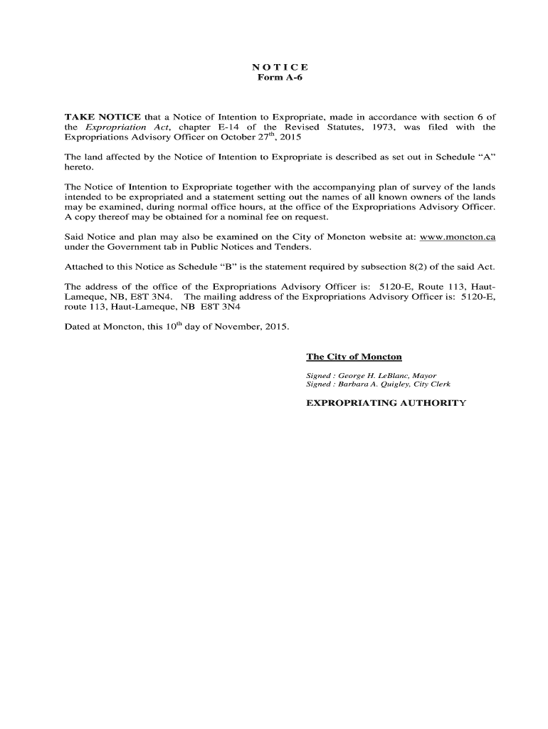 NOTICE Form A6 TAKE NOTICE that a Notice of Intention to Expropriate, made in accordance with section 6 of the Expropriation Act, chapter E14 of the Revised Statutes, 1973, was filed with the Expropriations