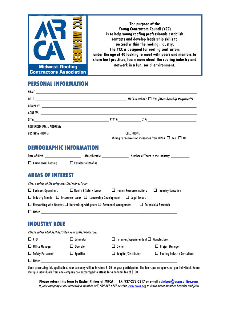 The purpose of the Young Contractors Council (FCC) is to help young roofing professionals establish contacts and develop leadership skills to succeed within the roofing industry. The FCC is designed