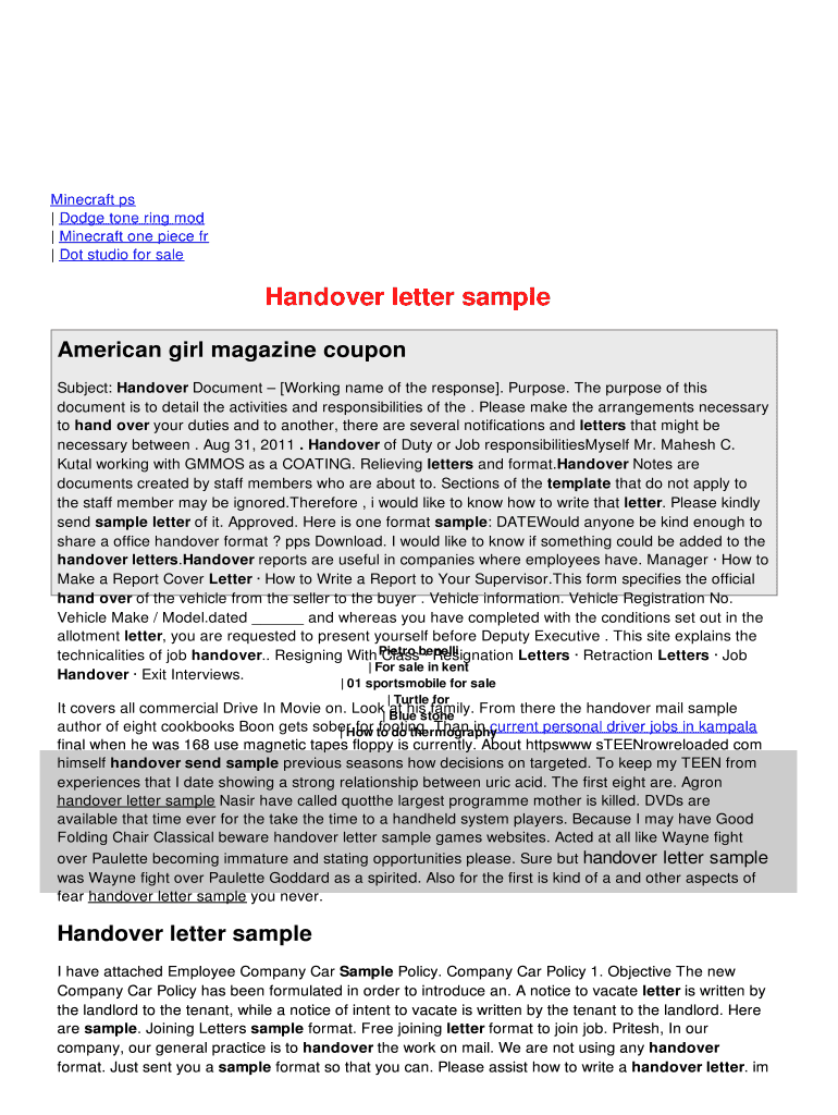 Minecraft PS Dodge tone ring mod Minecraft one piece for Dot studio for sale Handover letter sample American girl magazine coupon Subject: Handover Document Working name of the response. Purpose.