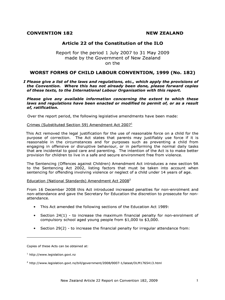 Get the free New Zealand Article 22 Report on Convention 182 - dol govt