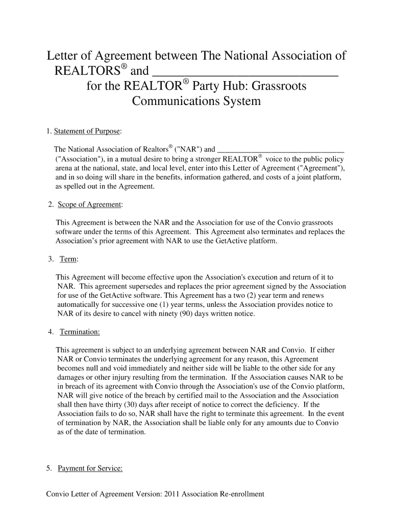 Letter of Agreement between The National Association of REALTORS and for the REALTOR Party Hub: Grassroots Communications System 1. Statement of Purpose: The National Association of Realtors (“NEAR