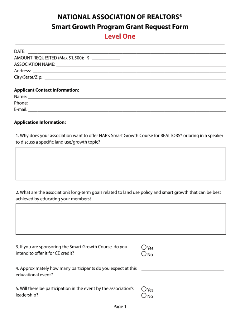NATIONAL ASSOCIATION OF REALTORS Smart Growth Program Grant Request Form Level One DATE: AMOUNT REQUESTED (Max $1,500): $ ASSOCIATION NAME: Address: City/State/Zip: Applicant Contact Information: