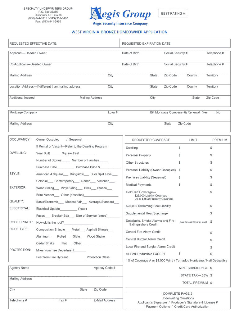 SPECIALTY UNDERWRITERS GROUP P.O. Box 36385 Cincinnati, OH 45236 (800) 8441815 / (513) 3516400 Fax: (513) 8415980 BEST RATING A WESTVIRGINIABRONZEHOMEOWNERAPPLICATION REQUESTED EFFECTIVE DATE: REQUESTED