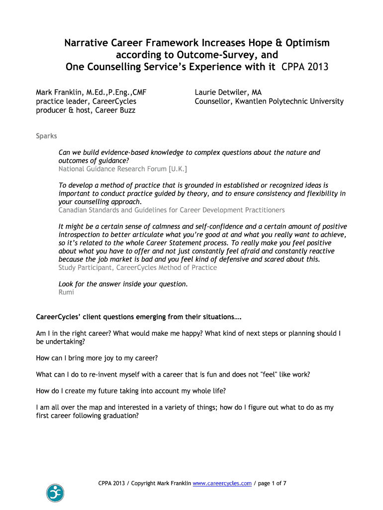 Narrative Career Framework Increases Hope & Optimism according to OutcomeSurvey, and One Counselling Services Experience with it CPA 2013 Mark Franklin, M. Ed., P. Eng., CMF practice leader, CareerCycles