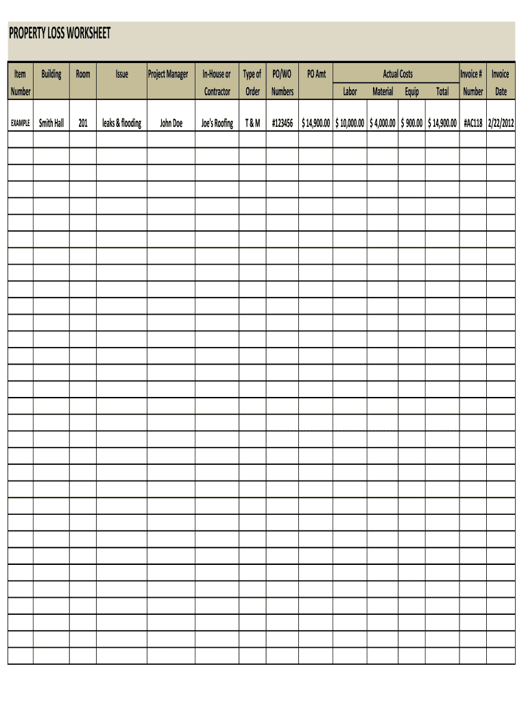 PROPERTY LOSS WORKSHEET Item Building. Room. Issue. Project Manager. In House or. Type of. PO/TO. PO Amt. Actual Costs. Invoice # Invoice. Number. Contractor. Order