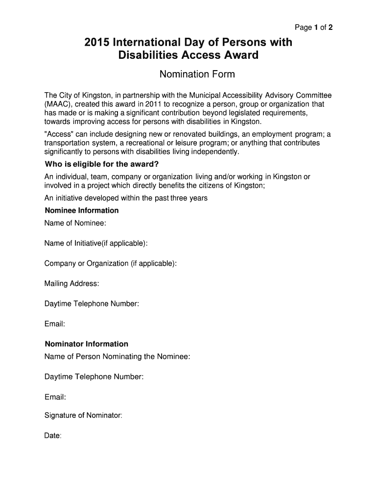 Page 1 of 2 2015 International Day of Persons with Disabilities Access Award Nomination Form The City of Kingston, in partnership with the Municipal Accessibility Advisory Committee (MAC), created