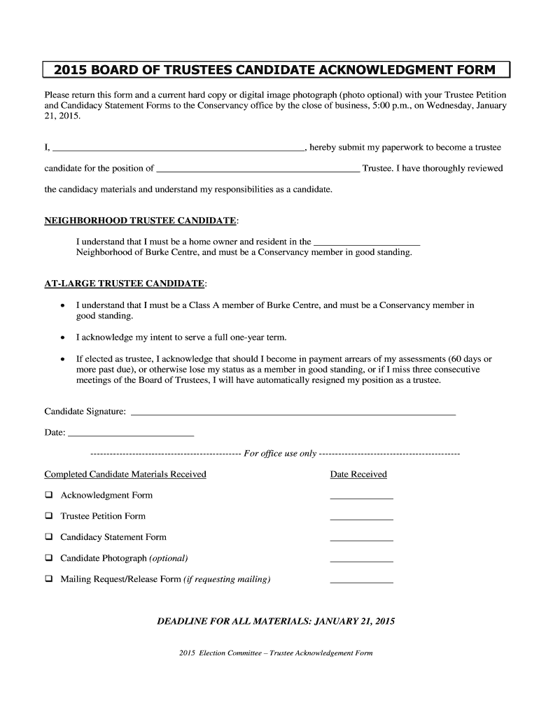 Get the free 2015 BOARD OF TRUSTEES CANDIDATE ACKNOWLEDGMENT FORM - burkecentre
