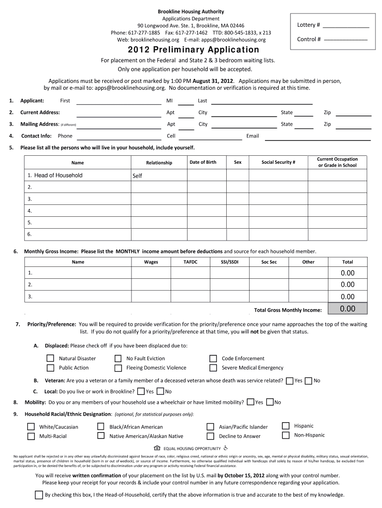 Get the free Ne 2012 Preliminary Application - Brookline Housing - brooklinehousing