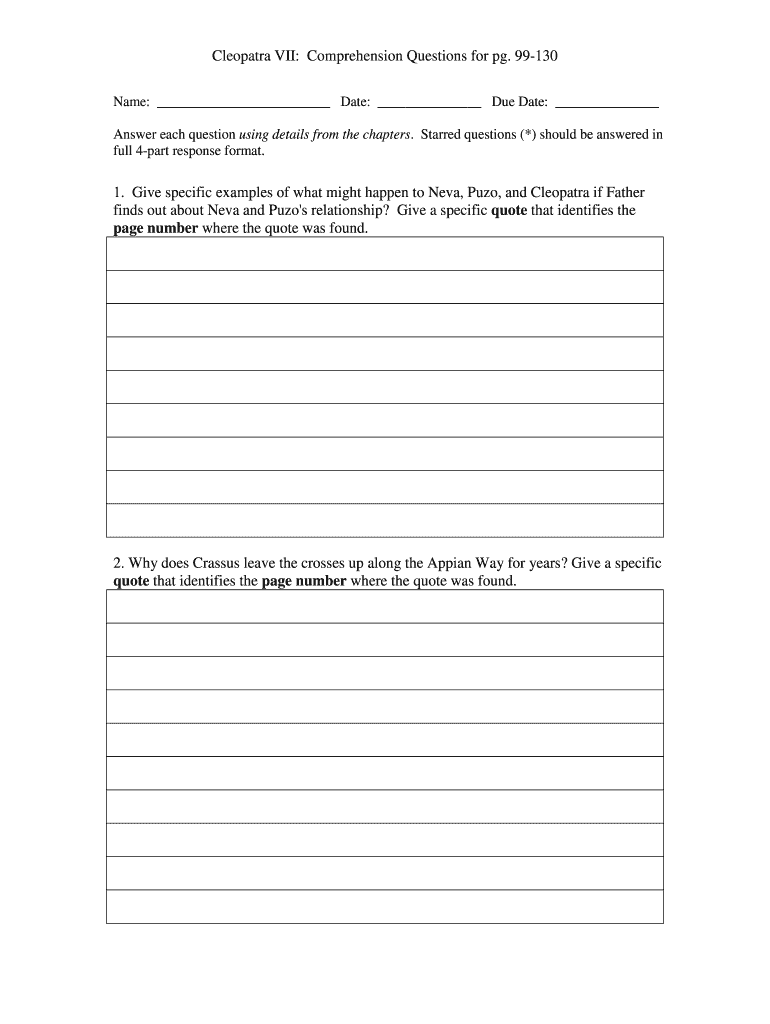 Cleopatra VII: Comprehension Questions for pg. 99130 Name: Date: Due Date: Answer each question using details from the chapters. Starred questions (*) should be answered in full 4part response format.