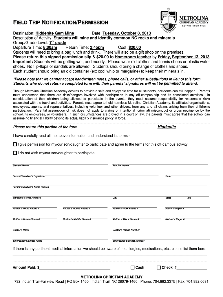 FIELD TRIP NOTIFICATION/PERMISSION Destination: Hidden ite Gem Mine Date: Tuesday, October 8, 2013, Description of Activity: Students will mine and identify common NC rocks and minerals Group/Grade