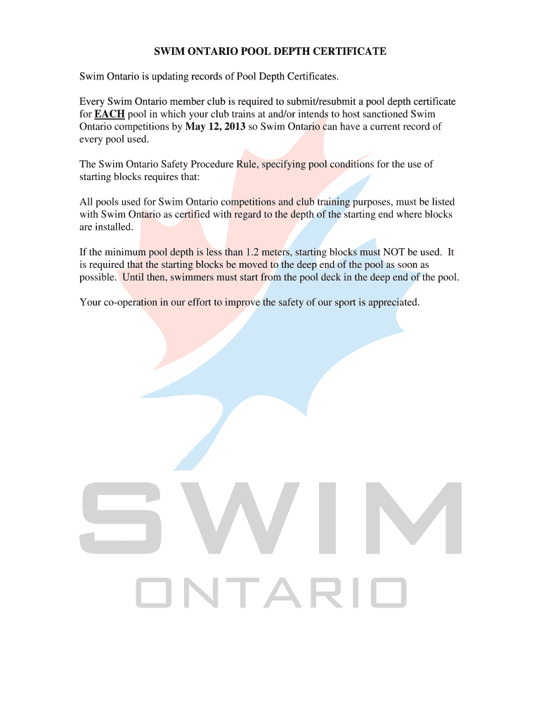 Get the free SWIM ONTARIO POOL DEPTH LENGTH CERTIFICATE