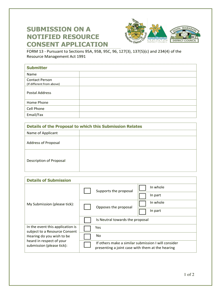 A form for individuals to submit their opinions regarding a notified resource consent application under the Resource Management Act 1991.