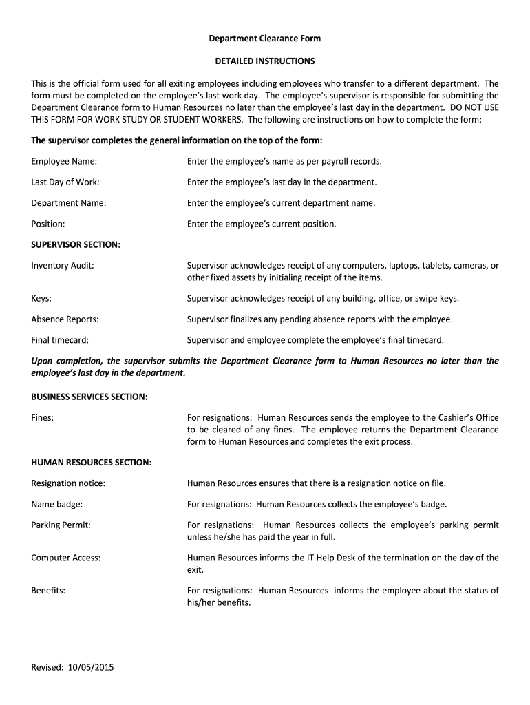 Get the free Department Clearance Form DETAILED INSTRUCTIONS