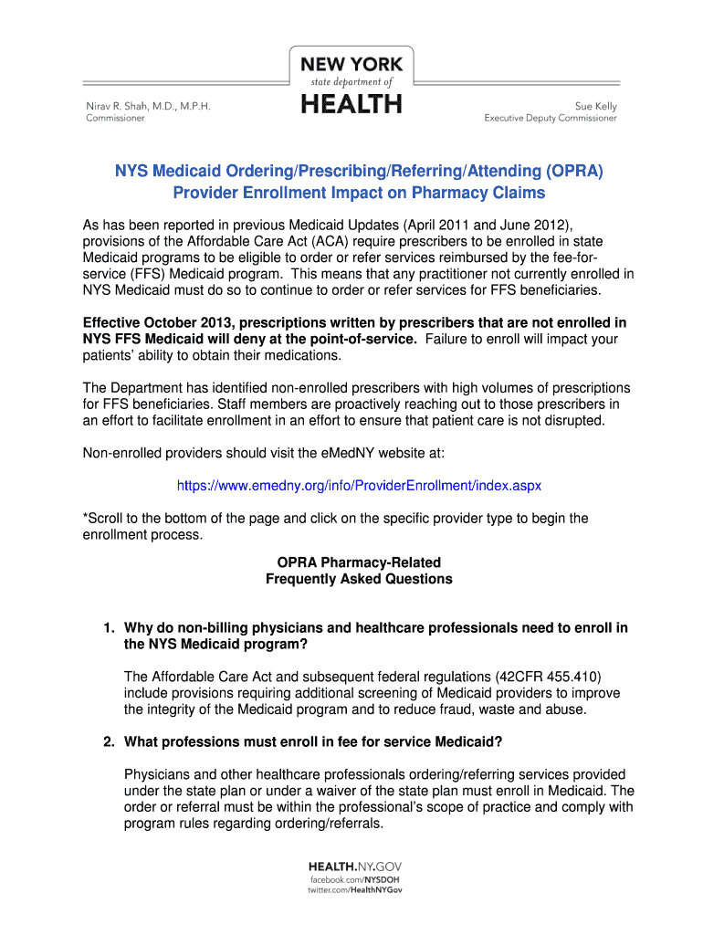 Medicaid patients: Individuals who are enrolled in the New York State Medicaid program and require services that need to be ordered, prescribed, referred, or attended by a healthcare provider will need the OPRA process to be followed by their provider.