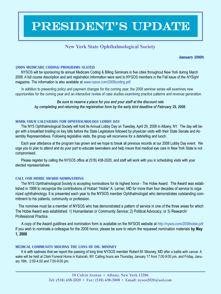 Get the free UPDATE PRESIDENTS UPDATE New York State Ophthalmological Society January 2008 2008 M...