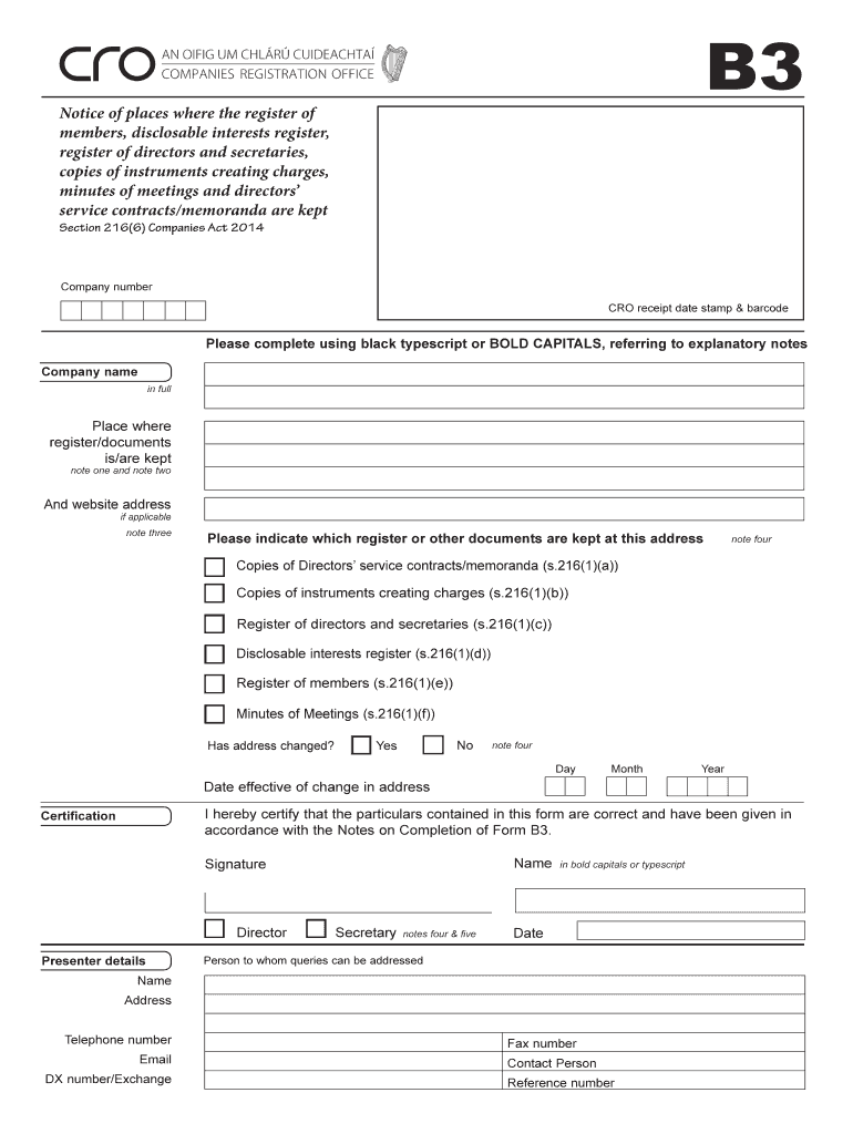 B3 Notice of places where the register of members, disclosable interests register, register of directors and secretaries, copies of instruments creating charges, minutes of meetings and directors